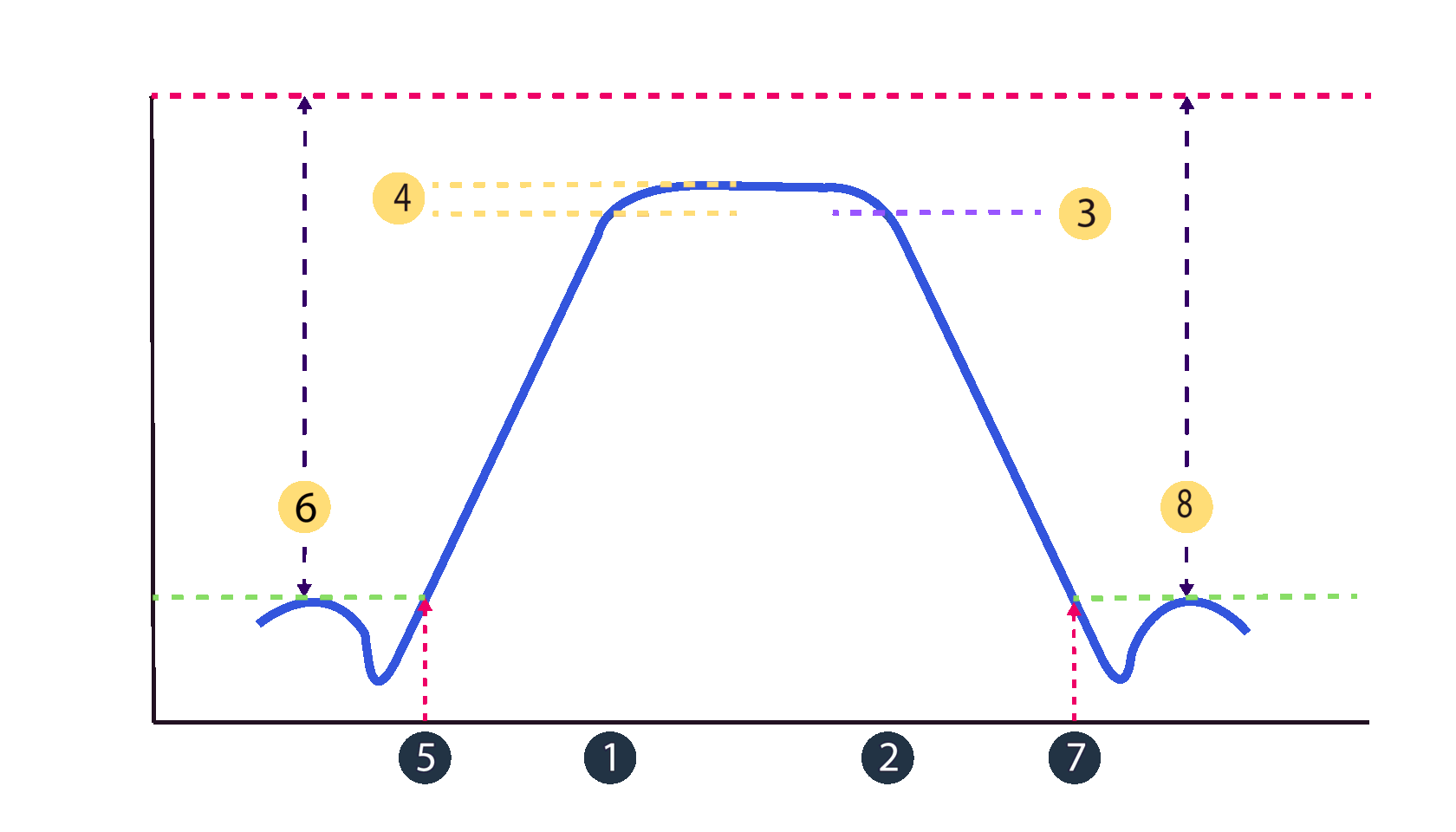 1.) Нижняя частота полосы пропускания (МГц) 2.) Верхняя частота полосы пропускания (МГц) 3.) Затухание в полосе пропускания, (дБ) 4.) Неравномерность в полосе пропускания (дБ) 5.) Нижняя частота загрождения (МГц) 6.) Затухание в нижней частоте заграждения (дБ) 7.) Верхняя частота загрождения (МГц) 8.) Затухание в верхней частоте заграждения (дБ)